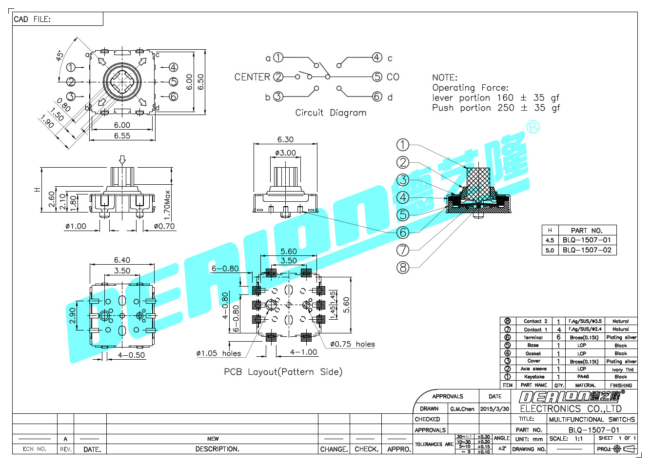 多功能開關(guān),型號:BLQ-1507-01,尺寸:6.0mm*6.2mm,由德藝隆精密工業(yè)股份有限公司研發(fā)生產(chǎn)。自主開發(fā)產(chǎn)品包括多功能開關(guān)、輕觸開關(guān)、檢測開關(guān)、滑動開關(guān)、帶燈輕觸開關(guān)、按鍵開關(guān)、微動開關(guān)、耳機插座、DC插座等。